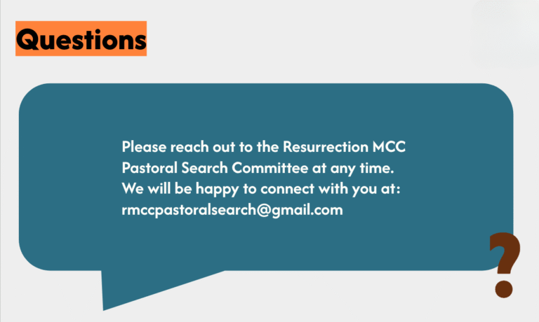 The Resurrection MCC Pastoral Search Committee will review the application, sermons, and relevant documents, then follow up with the following steps. We look forward to working with you and are excited to learn more about you throughout this process!
